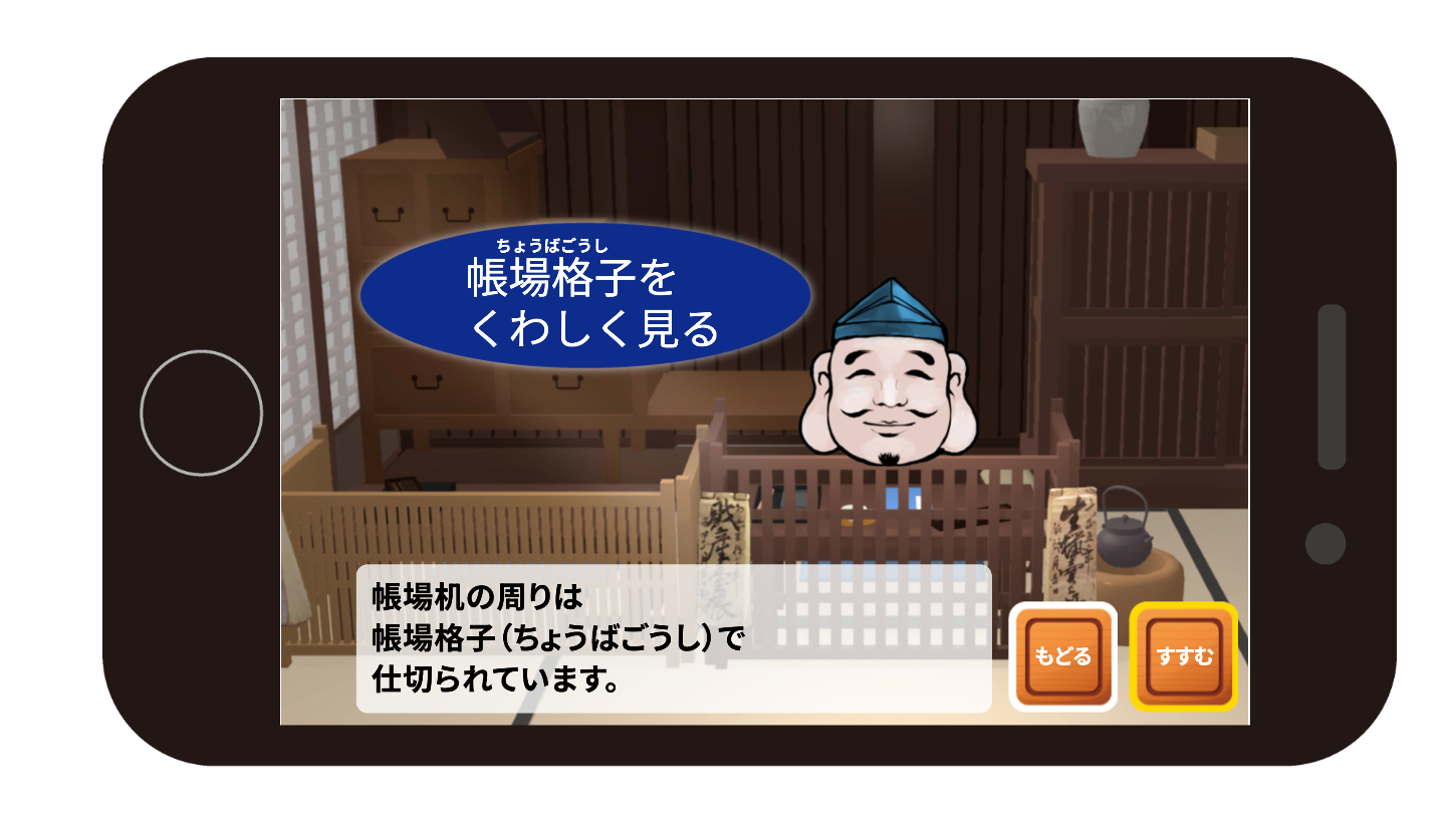 スマートフォンカメラ内に登場するキャラクターが大乗寺仏殿について解説するコンテンツです。